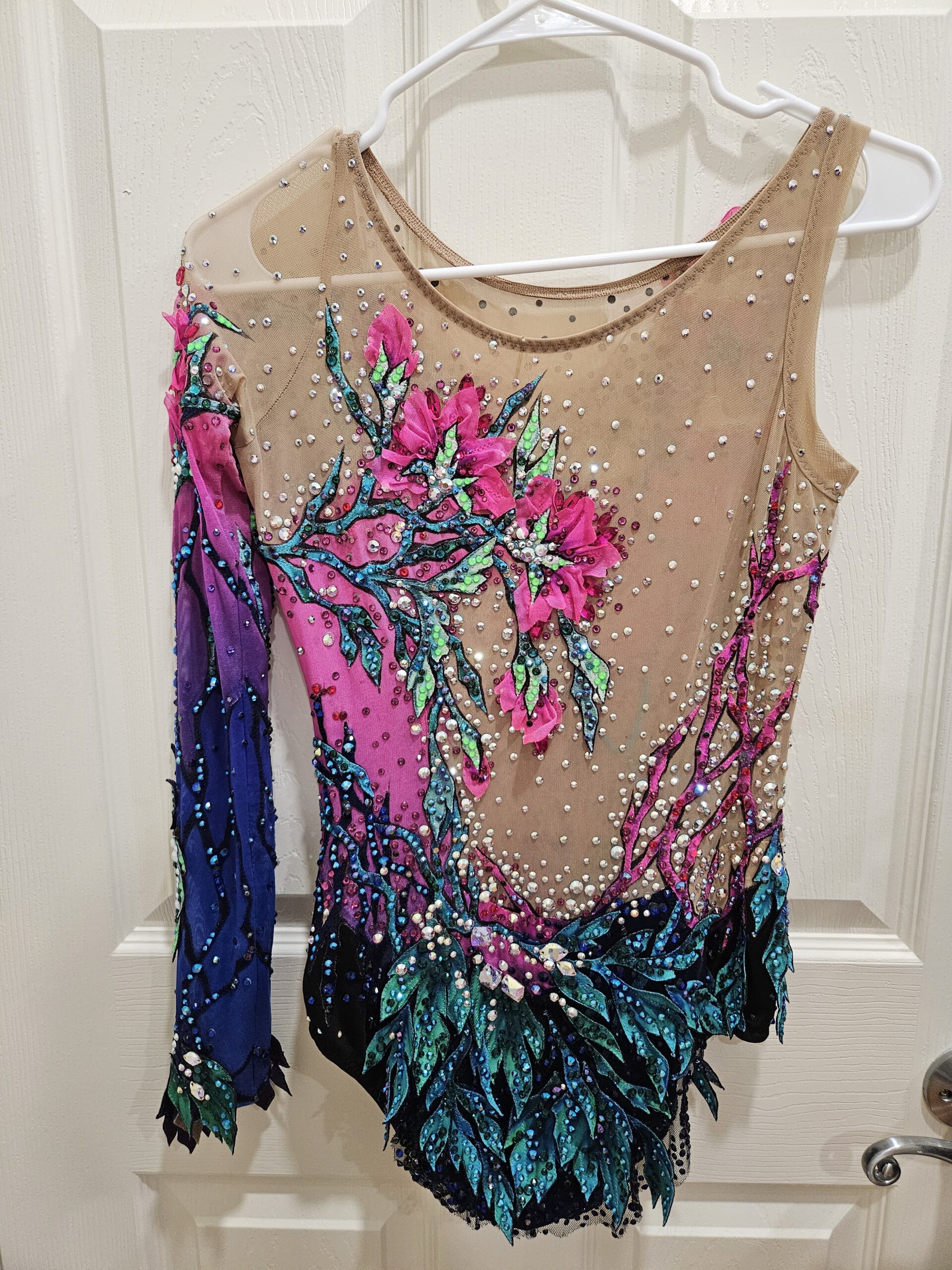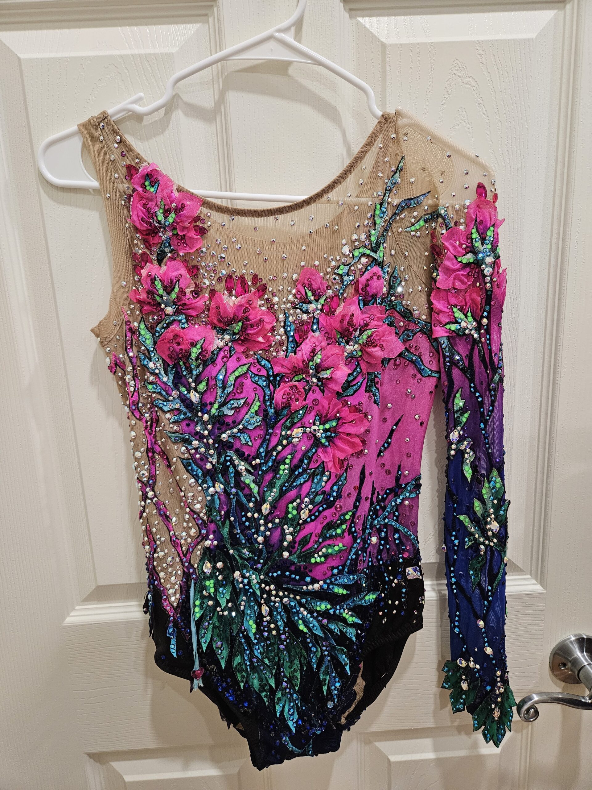 Flowers stay closed until a gymnast pulls a special string and they open up. 100% Swarovski Crystals.